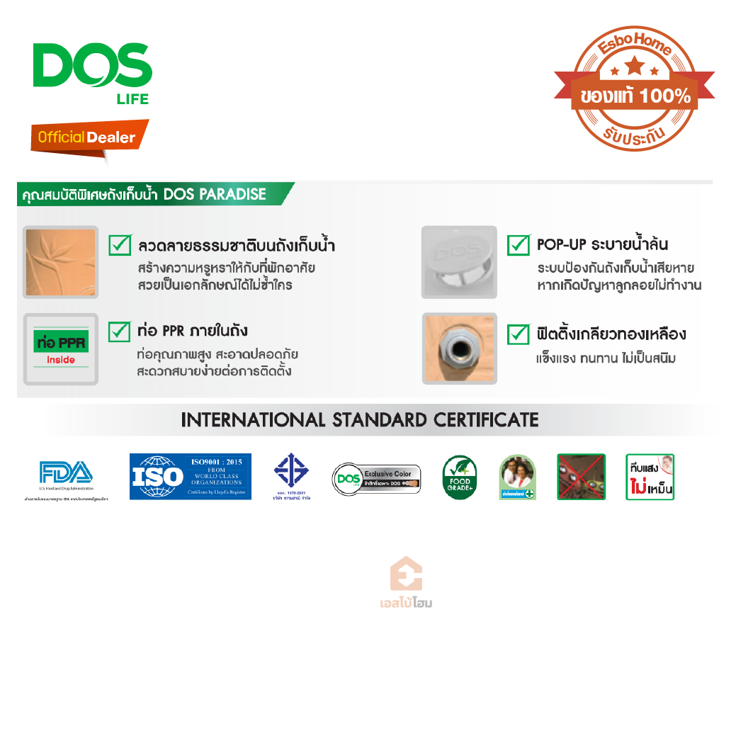 สะอาดกว่า แข็งแรงกว่า เหนียวกว่า ถังเก็บน้ำ DOS PARADISE Ag+ Silver Combac Anti-Microbial ความเหนือชั้นอีกระดับกับวัสดุใหม่ ที่มาพร้อมกับความเหนียว ทนทานที่มากกว่าเดิม และสะอาด ปลอดภัย ด้วยเทคโนโลยี DOS Ag+ Silver Combac Anti-Microbial ได้รับการพัฒนาร่วมกับคณะวิทยาศาสตร์ จุฬาลงกรณ์มหาวิทยาลัย และได้รับมาตรฐานการรับรอง NanoQ จากสมาคมนาโนเทคโนโลยีแห่งประเทศไทย เป็นรายแรกและรายเดียว นวัตกรรมใหม่แห่งการป้องกันขั้นสูง DOS Protection UV20 ทนทานต่อรังสี UV สูงสุดถึงระดับ 20 ใช้งานได้ยาวนาน รองรับสภาพอากาศร้อนชื้น รับประกัน LIFETIME WARRANTY