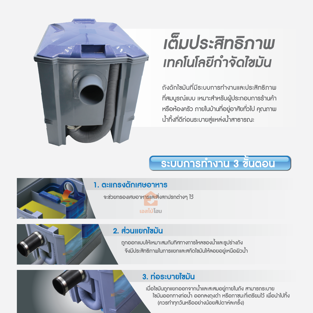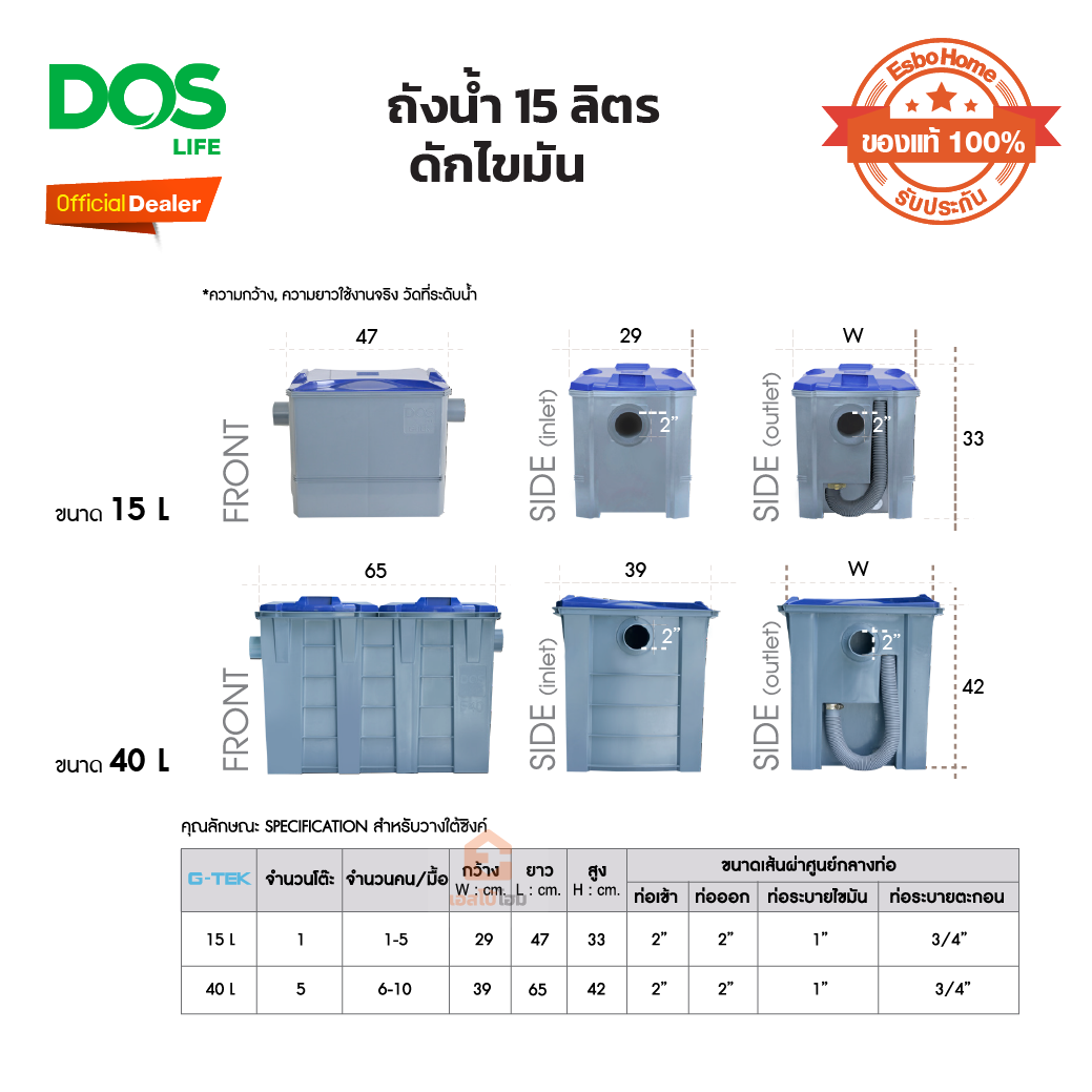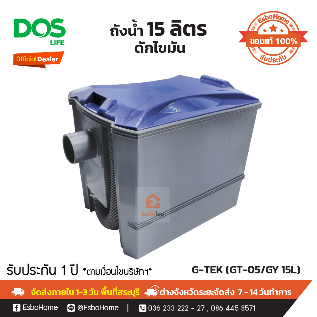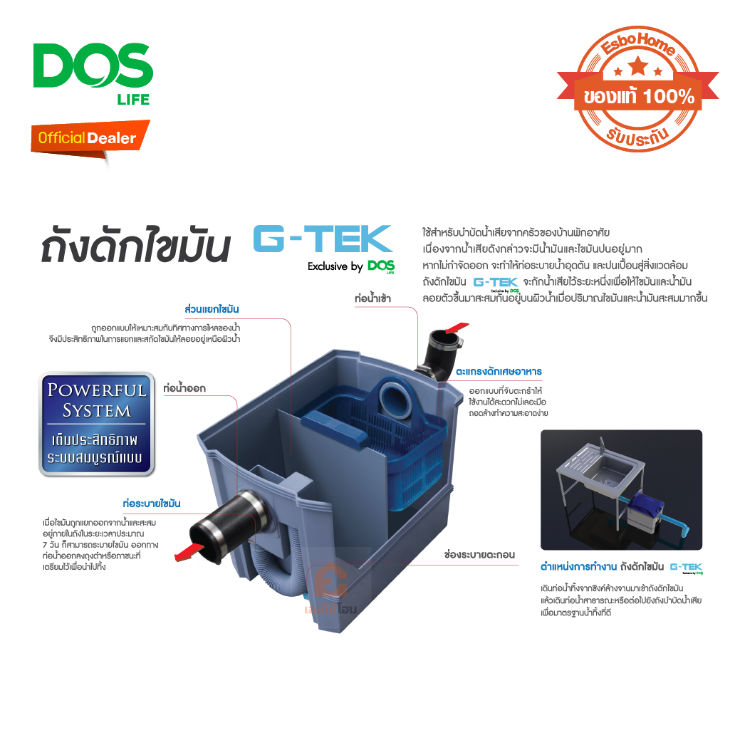 ถังดักไขมัน ใช้สำหรับบำบัดน้ำเสียจากครัวของบ้านพักอาศัย ห้องอาหารหรือภัตตาคาร เนื่องจาก น้ำเสียดังกล่าวจะมีน้ำมันและไขมันปนอยู่มาก หากไม่จำกัดออกจะทำให้ท่อระบายน้ำอุดตัน ถังดักไขมัน DOS G-TEK จะกักน้ำเสียไว้ระยะหนึ่งเพื่อให้ไขมันและน้ำมันลอยตัวขึ้นมาสะสมกันอยู่บนผิวน้ำ เมื่อปริมาณไขมันและน้ำมันสะสมมากขึ้น ตำแหน่งการทำงาน เดินท่อน้ำทิ้งจาก ซิงค์ล้างจาน มาเข้าถังดักไขมัน แล้วเดินท่อน้ำทิ้งออกสู่ ท่อน้ำสาธารณะ หรือต่อไปยังถังบำบัดน้ำเสีย เพื่อมาตรฐานน้ำที่ดี