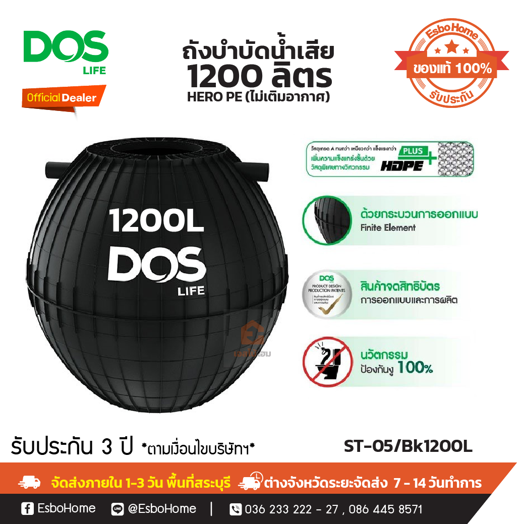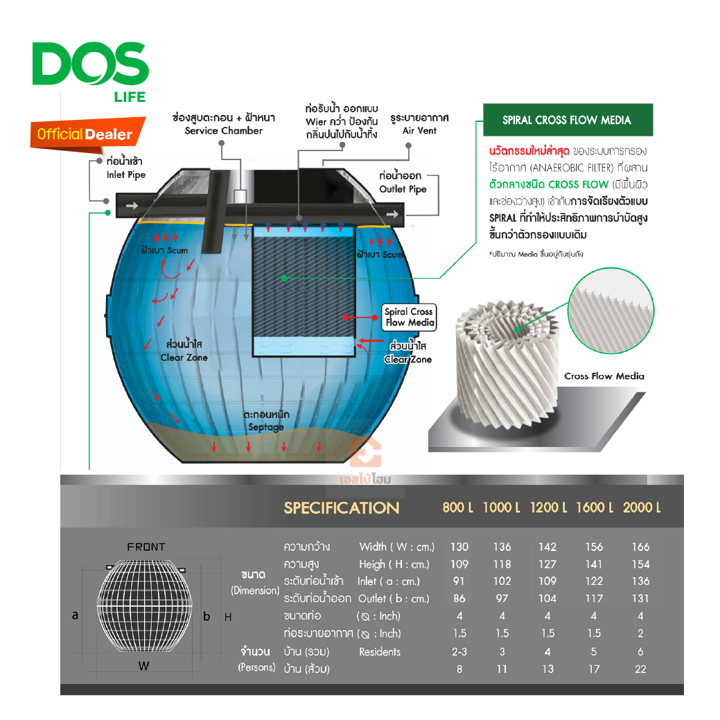 ความจุ 1,200 ลิตร รองรับผู้อยู่อาศัย 4–5 คน ผลิตจาก HDPE PLUS แข็งแรง ทนทาน ใช้งานยาวนาน เทคโนโลยี Spiral Cross Flow Media เพิ่มประสิทธิภาพการบำบัดน้ำเสีย
