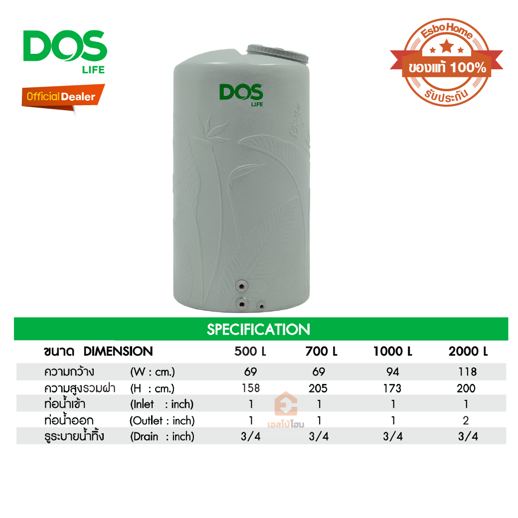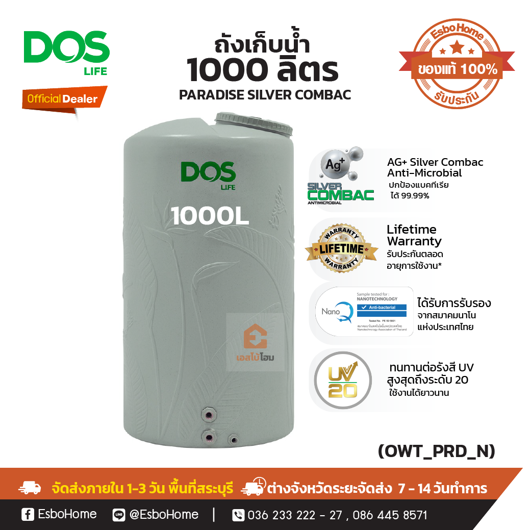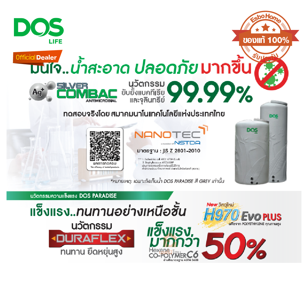 สะอาดกว่า แข็งแรงกว่า เหนียวกว่า ถังเก็บน้ำ DOS PARADISE Ag+ Silver Combac Anti-Microbial ความเหนือชั้นอีกระดับกับวัสดุใหม่ ที่มาพร้อมกับความเหนียว ทนทานที่มากกว่าเดิม และสะอาด ปลอดภัย ด้วยเทคโนโลยี DOS Ag+ Silver Combac Anti-Microbial ได้รับการพัฒนาร่วมกับคณะวิทยาศาสตร์ จุฬาลงกรณ์มหาวิทยาลัย และได้รับมาตรฐานการรับรอง NanoQ จากสมาคมนาโนเทคโนโลยีแห่งประเทศไทย เป็นรายแรกและรายเดียว นวัตกรรมใหม่แห่งการป้องกันขั้นสูง DOS Protection UV20 ทนทานต่อรังสี UV สูงสุดถึงระดับ 20 ใช้งานได้ยาวนาน รองรับสภาพอากาศร้อนชื้น รับประกัน LIFETIME WARRANTY